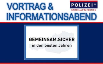 ![]() | Vortrag & Informationsabend GEMEINSAM.SICHER Sie erhalten hilfreiche Tipps für den Alltag, damit Sie weder Zuhause, auf der Straße noch im Internet Opfer von Kriminalität werden. |