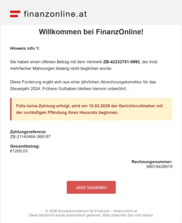 ![]() | BMF warnt vor betrügerischen SMS- und WhatsApp-Nachrichten Internetbetrüger versuchen mit Hilfe von gefälschten SMS- und WhatsApp-Nachrichten an persönliche Daten von Bürgerinnen und Bürgern zu gelangen. |