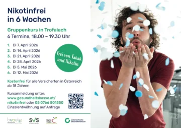 Nikotinfrei in 6 Wochen Gruppenkurs in Trofaiach 6 Termine, 18.00 – 19.30 Uhr Di 7. April 2026 Di 14. April 2026 Di 21. April 2026 Di 28. April 2026… |
