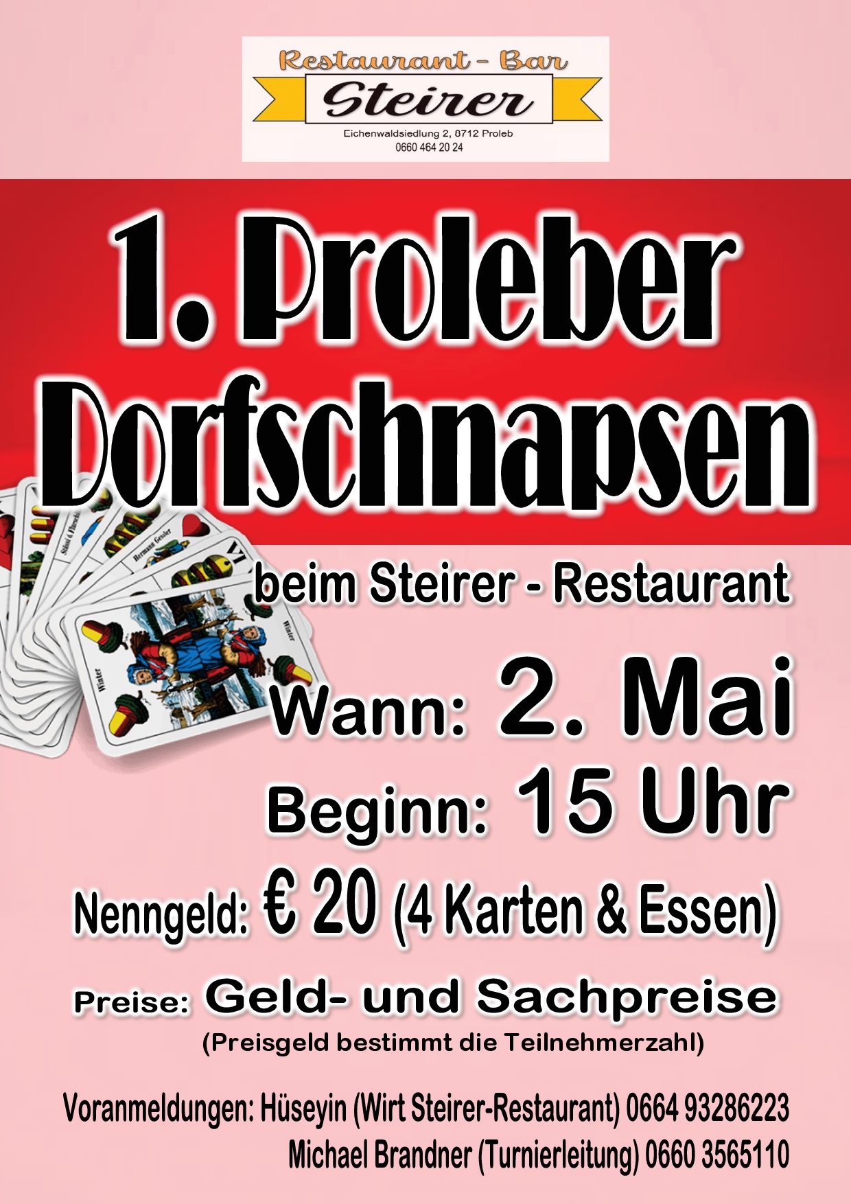 Donnerstag, 16. April 20261. Proleber Dorfschnapsen beim Steirer-Restaurant2. Mai 202615:00 UhrSteirer - RestaurantFeldtyp nicht unterstützt.