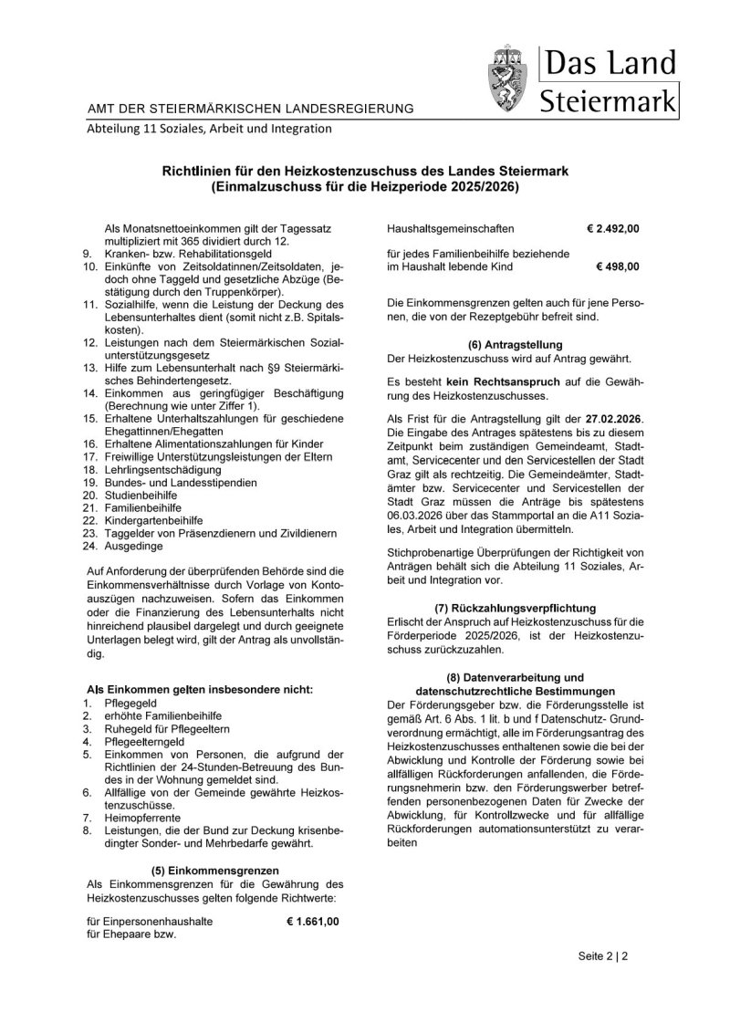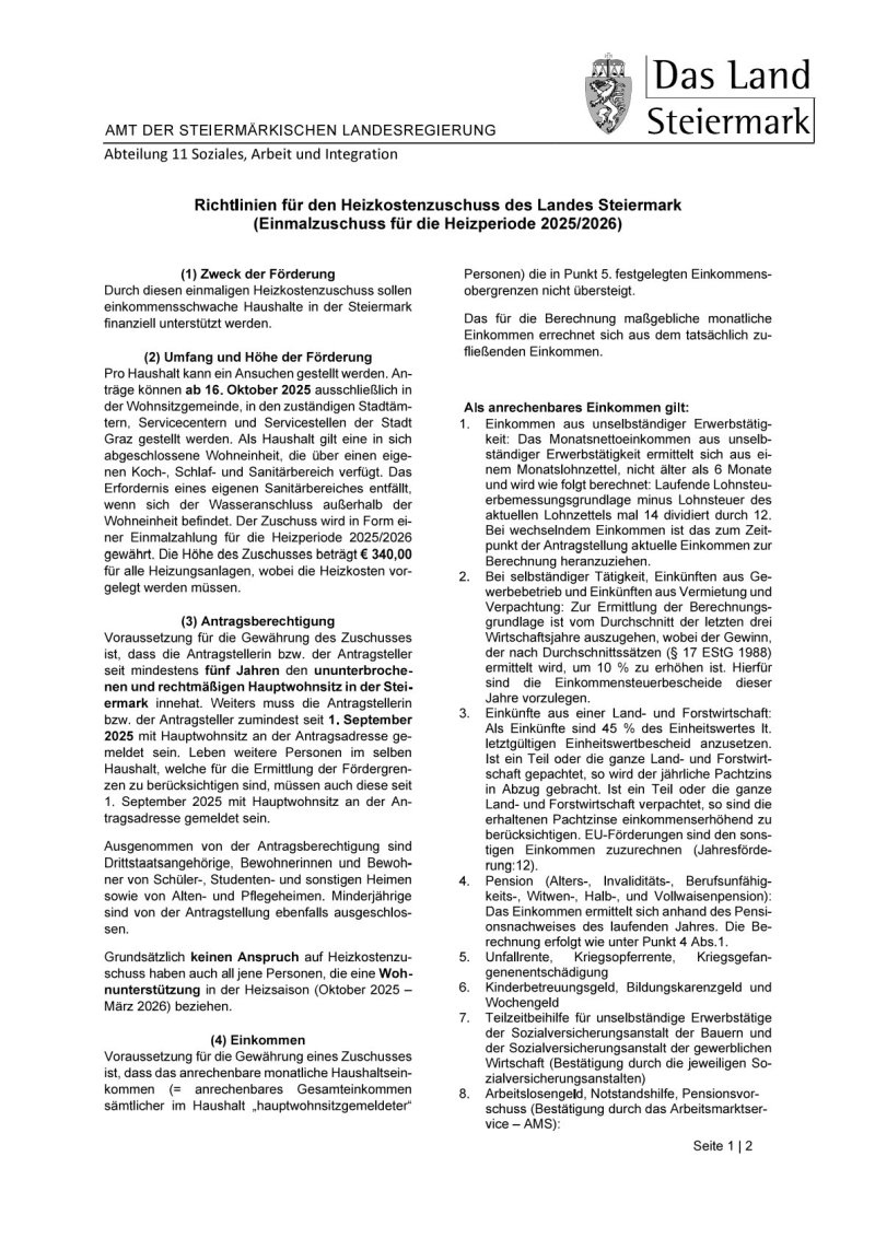 Das Land Steiermark gewährt über Antrag einen einmaligen Heizkostenzuschuss für einkommensschwache Haushalte. Die Höhe des Zuschusses beträgt € 340,00 für alle Heizungsanlagen, wobei die Heizkosten vorgelegt werden müssen.