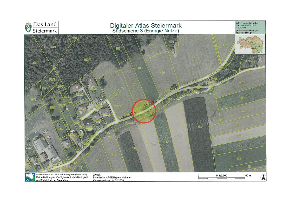 - Straßensperre aufgrund des Neubaus der Gasleitung DN400 (Südschiene 3) durch Grab-, Verfüll- und Wiederherstellungsarbeiten auf dem Grundstück Nr.: 461, einkommend in EZ 92, der KG 60320 Köllach, im Bereich der Grundstücksparzelle 108 bzw. 114, KG 60320 Köllach (siehe Anlage) in der Zeit von 02. März 2026 bis voraussichtlich 27. März 2026