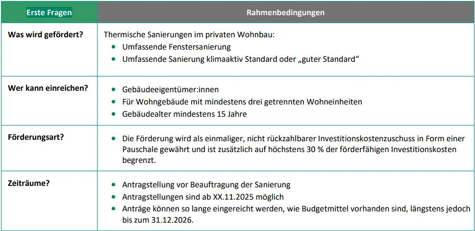 Die Bundesförderungen wurden im Rahmen der „Sanierungsoffensive 2026“ für den Heizkesseltausch und Gebäudesanierung 2026 wurden am 3. Oktober beschlossen, sie sind bis Ende 2026 gültig.
